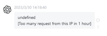 限流功能是限制相同 IP 的访客每小时最大的请求次数,同样是在chatgpt-web/service/.env文件中,将MAX_REQUEST_PER_HOUR设置一个访问次数。当对话超过设置的次数后会提示限制,只能等待下一个小时继续使用。