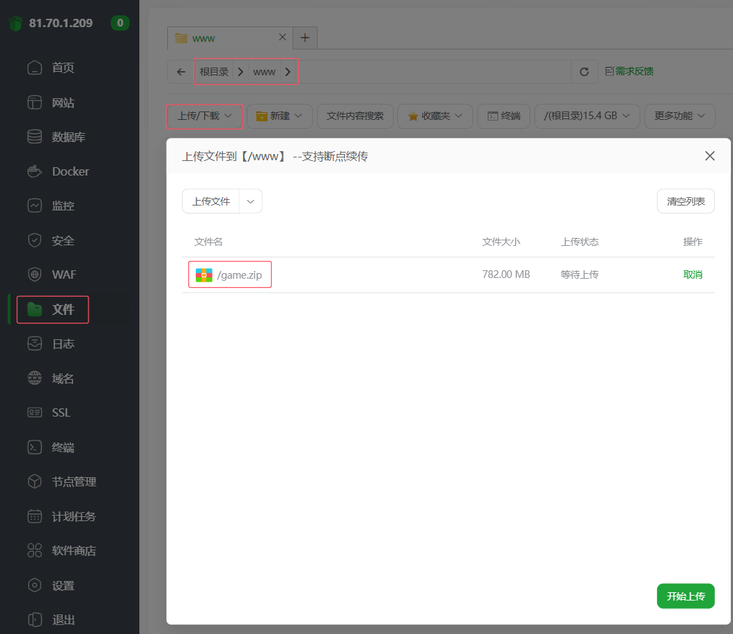 拿到源码后,将game.zip压缩文件通过宝塔上传到根目录,由于最新的宝塔禁止直接上传到根目录,可以先上传到任一目录下,再剪切粘贴到/根目录。或直接通过 finalshell 工具直接上传到根目录也可以。
