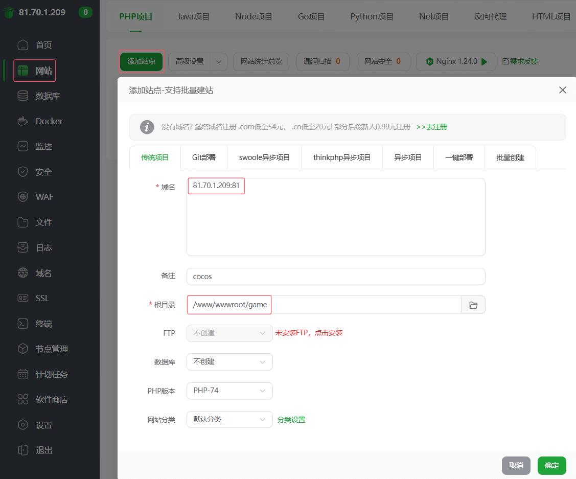 站点域名为 IP:81(你的服务器 IP),根目录为 /www/wwwroot/game,PHP 选择 7.4 版本。