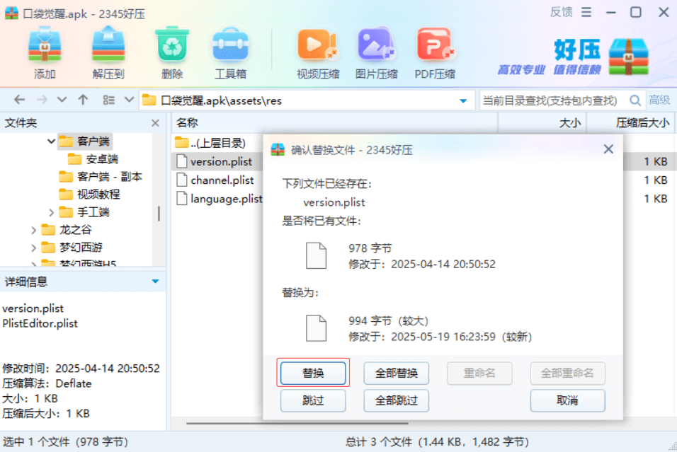 找到口袋觉醒.apk安卓客户端,用好压软件打开,将文件version.plist拖出来。找到工具目录下的Notepad++.exe打开该文件version.plist,将 IP(81.68.206.229)修改为你的服务器 IP。