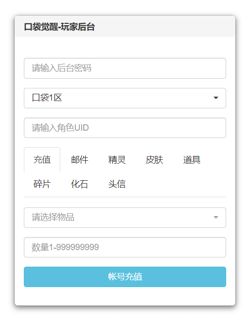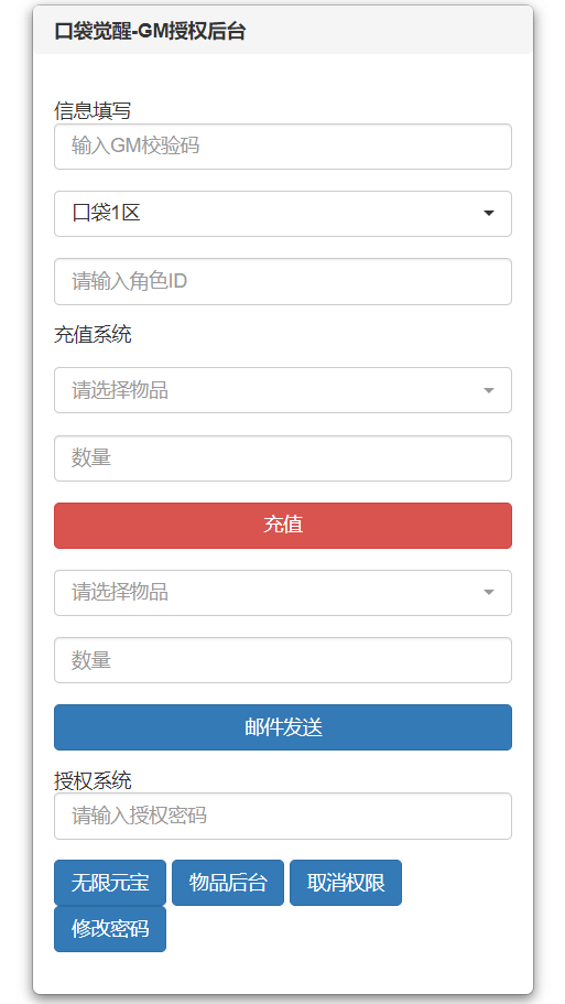 玩家后台链接:http://IP:81/gm/,授权过的玩家就可以充值和发送物品啦。