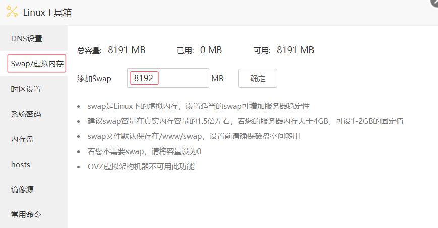 设置虚拟内存,Linux 工具箱添加 Swap,由于游戏占用内存比较大,建议直接加 8G 虚拟内存。