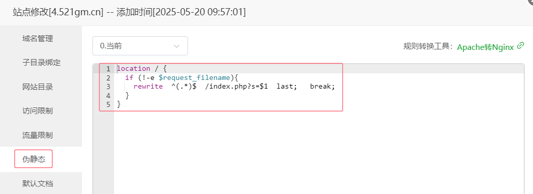 再次点击该站点进行编辑,域名管理中添加域名IP:84,再设置网站的伪静态。