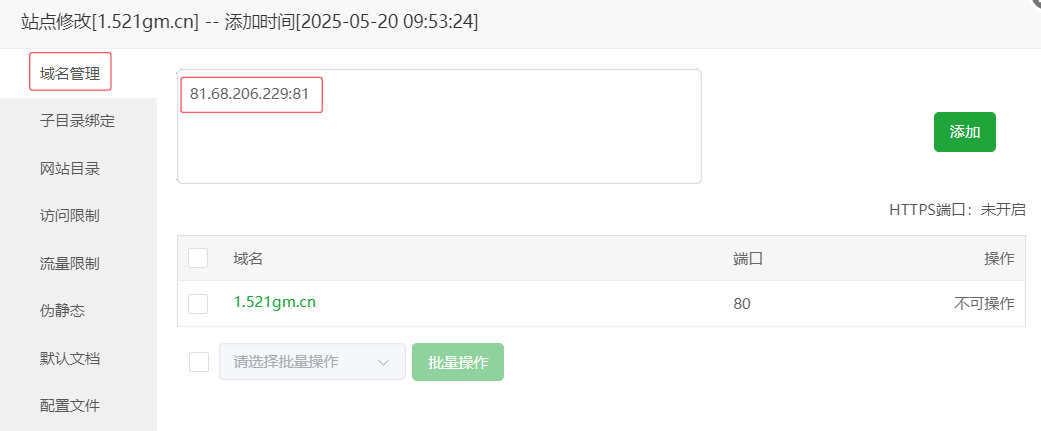 再次点击该站点进行编辑,域名管理中添加域名IP:81。