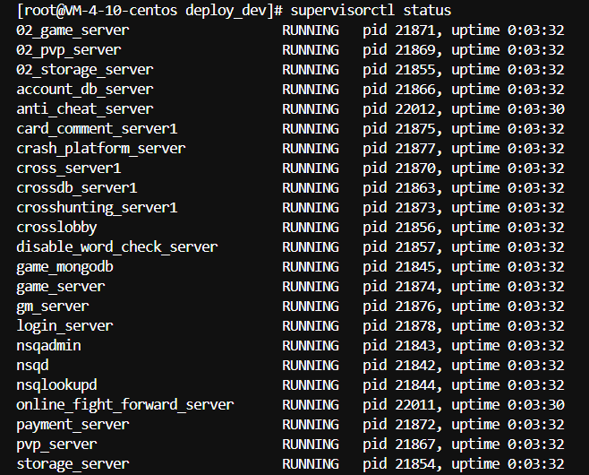 看到所有的服务都是 RUNNING 状态,就说明启动成功,如果有没启动的,需再次执行supervisorctl start all。