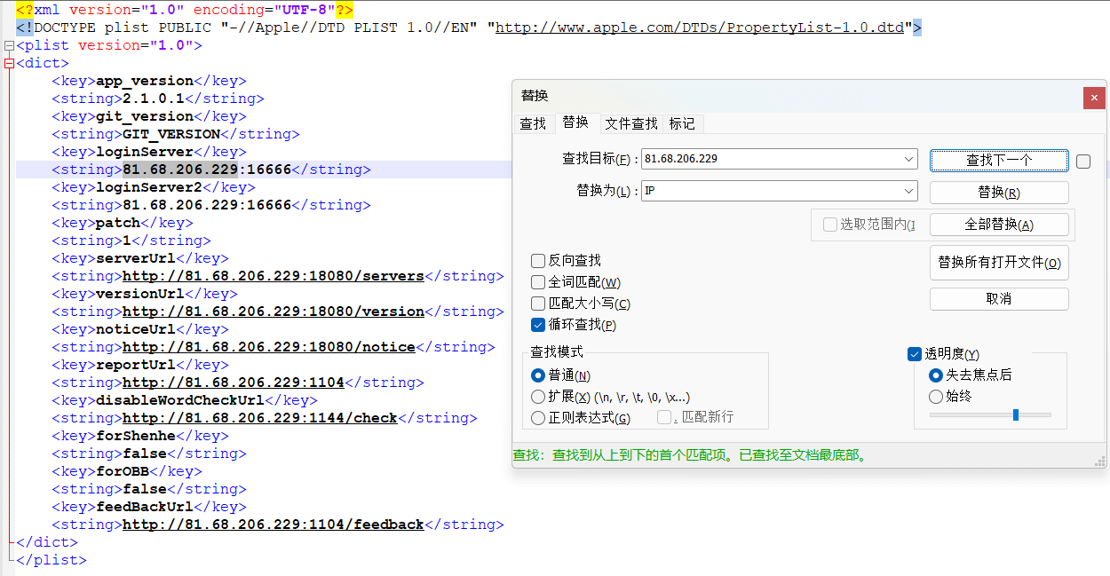 同样用好压打开苹果客户端口袋觉醒.ipa,将文件version.plist拖出来。同样使用Notepad++.exe打开该文件version.plist,将 IP(81.68.206.229)修改为你的服务器 IP。