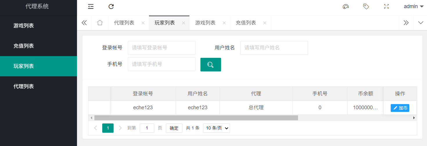 游戏也提供了代理后台,链接:http://IP:84,默认账号:admin,默认密码:123123,代理后台可以添加代理,给玩家发送代金券等。