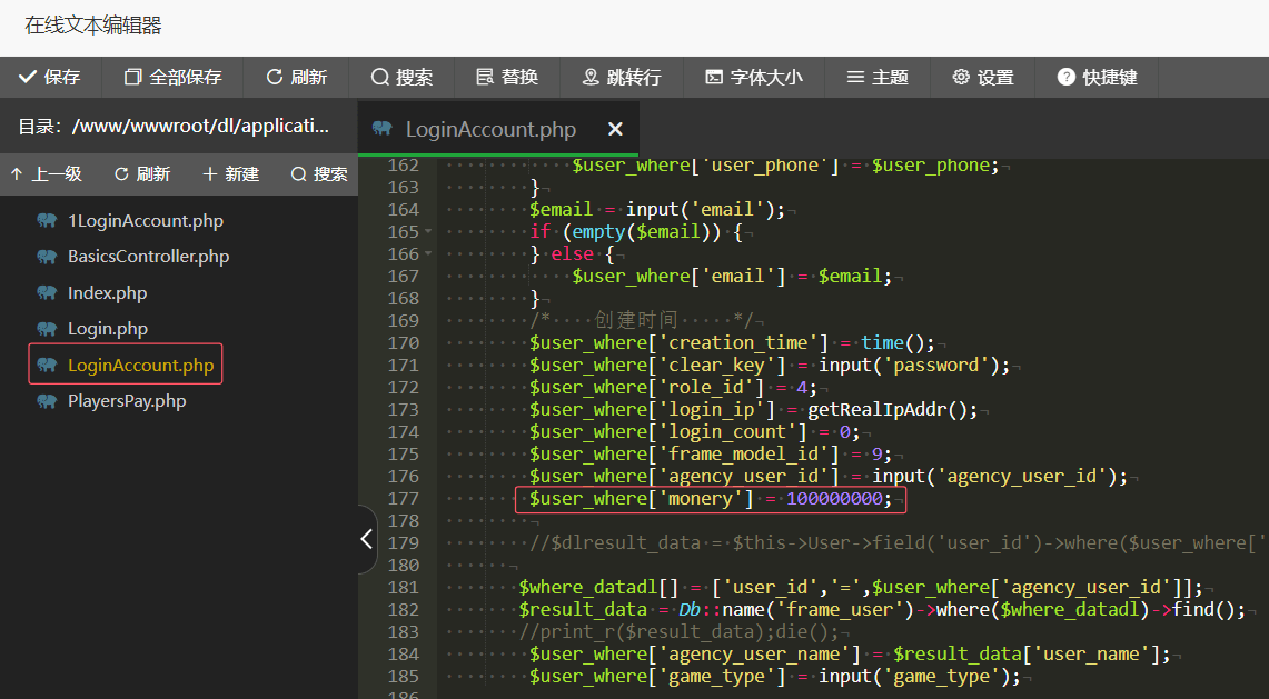 找到文件/www/wwwroot/dl/application/admin_login/controller/LoginAccount.php,在第 177 行添加$user_where['monery'] = 100000000;,设置的值就是代金券的数值。