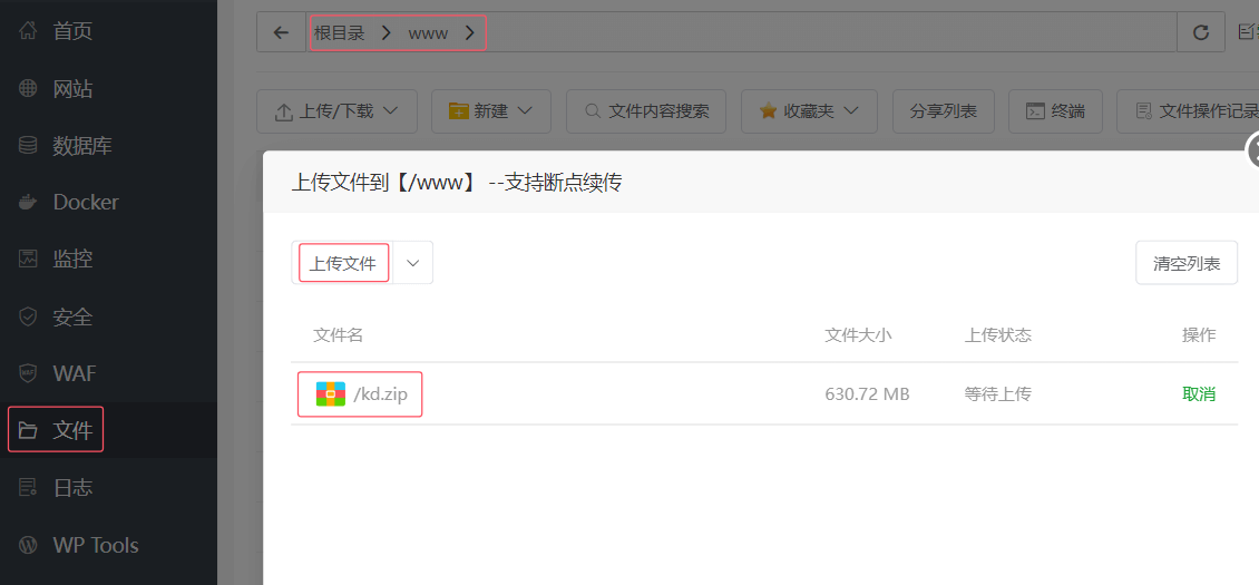 拿到源码后,将kd.zip压缩文件通过宝塔上传到根目录,由于最新的宝塔禁止直接上传到根目录,可以先上传到任一目录下,在剪切粘贴到/根目录。