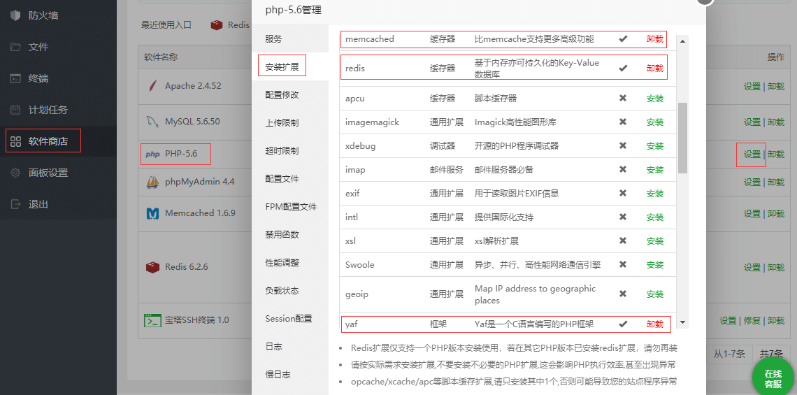 安装完后,需要安装PHP的三个扩展 redis / memcached / yaf。