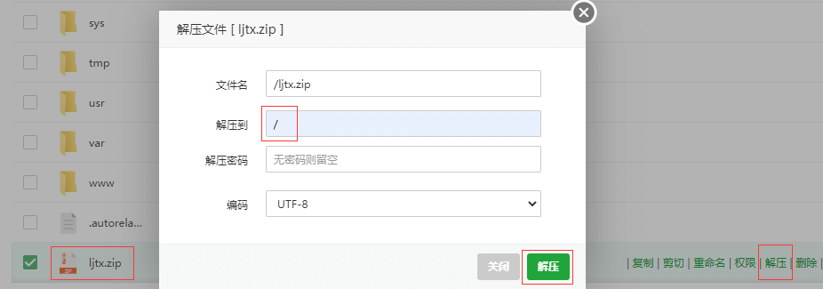 拿到源码后,将ljtx.zip压缩文件通过宝塔上传到根目录(如果宝塔禁止上传到根目录,可上传其他路径后剪切粘贴到根目录)。