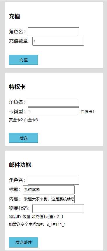 游戏GM工具访问链接:http://IP:82/gm1/s1.php,使用你服务器的IP,可以给玩家充值发送物品,具体的物品需要先查找到物品代码,按照指定格式发送,无需重新登陆游戏,邮箱实时收取。