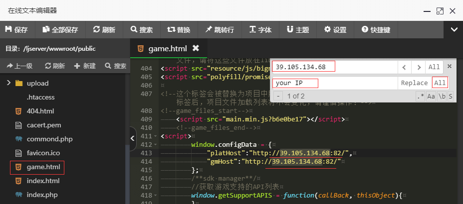以game.html文件为例,在宝塔中找到文件,双击修改,Ctrl+F批量替换IP。