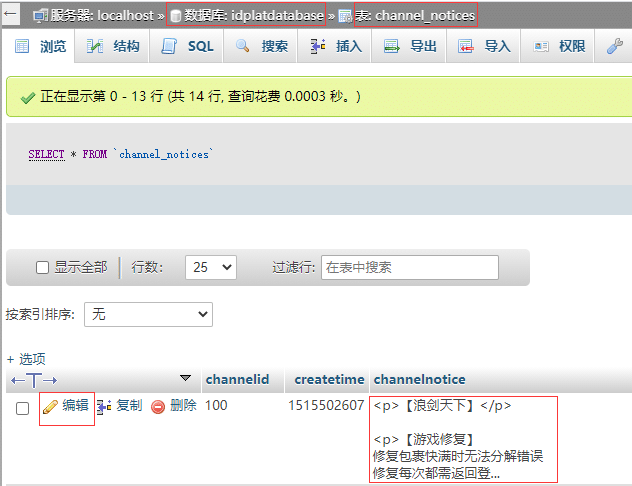 游戏的公告需读取数据库idplatdatabase表channel_notices,在phpMyAdmin中可以直接修改游戏公告。