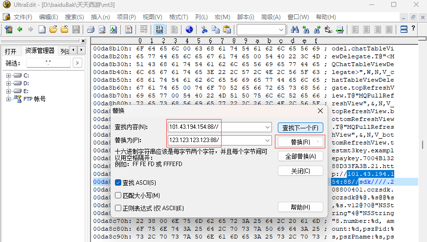 点击工具菜单搜索 - 替换,记得勾选查找 ASCII,查找 101.43.194.154:88//,替换为你的 IP,注意要对位,保持位数一致 19 位。比如你的 IP 是 11.22.123.44,那么就需要补 / 改为 11.22.123.44:88//// 达到 19 位。如果你的 IP 是15位,如 123.123.123.123 那么就需要去掉 / 改为 123.123.123.123:88/ 达到 19 位。