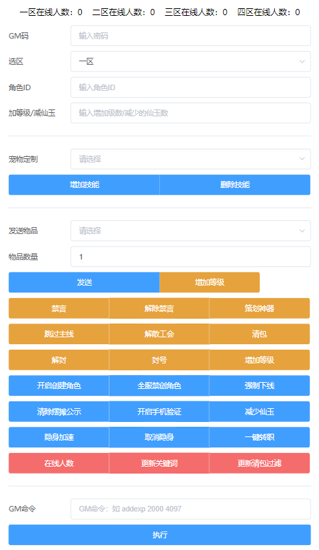 游戏 GM 后台链接:http://ip:81/gm/gm/gm.php,默认 GM 码:123456,如果想修改 GM 码需要修改文件 /www/wwwroot/81/gm/gm/conn.php 中的 $gmpwd 字段值即可。