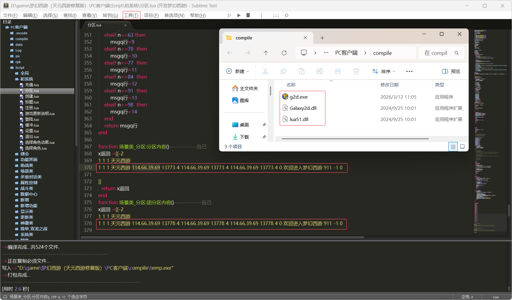 修改完 IP 后保存,点击 sublime 编辑器上方的工具-编译,编译所有的 LUA 文件,编译完后会自动弹窗文件夹,里面会有编译好的 3 个文件。
