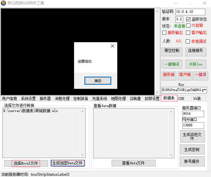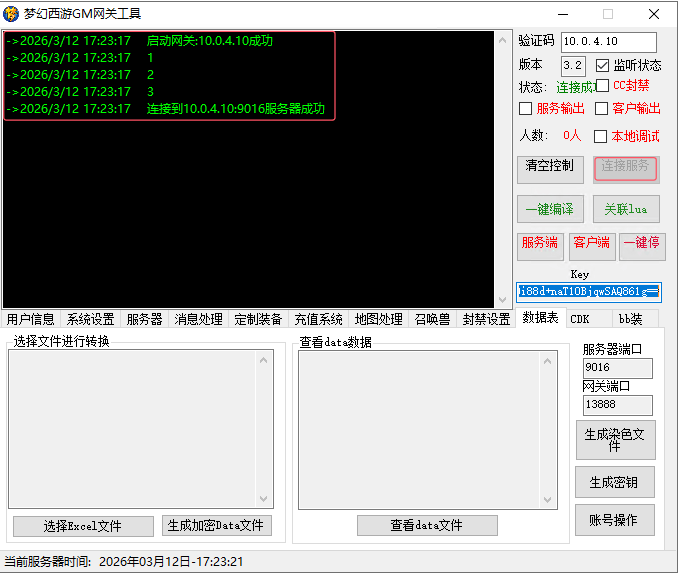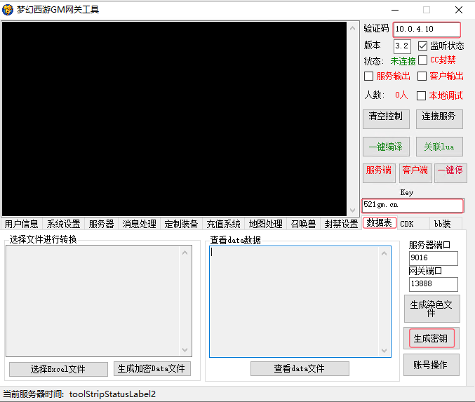 首先说下服务端的 GM 工具梦幻西游网关,需要在服务器上(本机不行),双击打开文件D:\server\梦幻西游网关.exe,验证码填写你的服务器内网 IP,Key 填写521gm.cn,下方数据表页签中,点击生成密钥按钮。