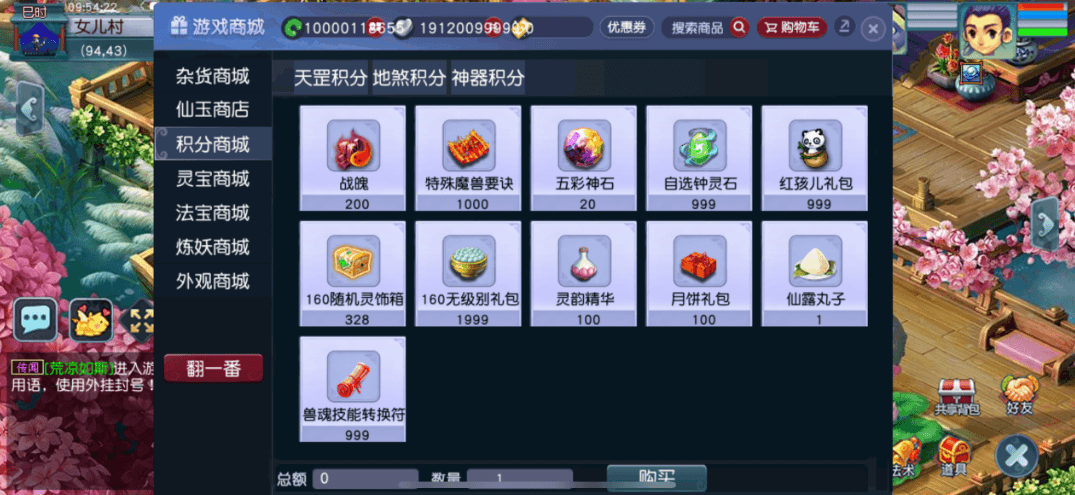 - 天罡地煞积分商店添加自选钟灵石、红孩儿礼包、160随机灵饰箱、160无级别礼包、灵韵精华、月饼礼包、仙露丸子、兽魂技能转换符等道具