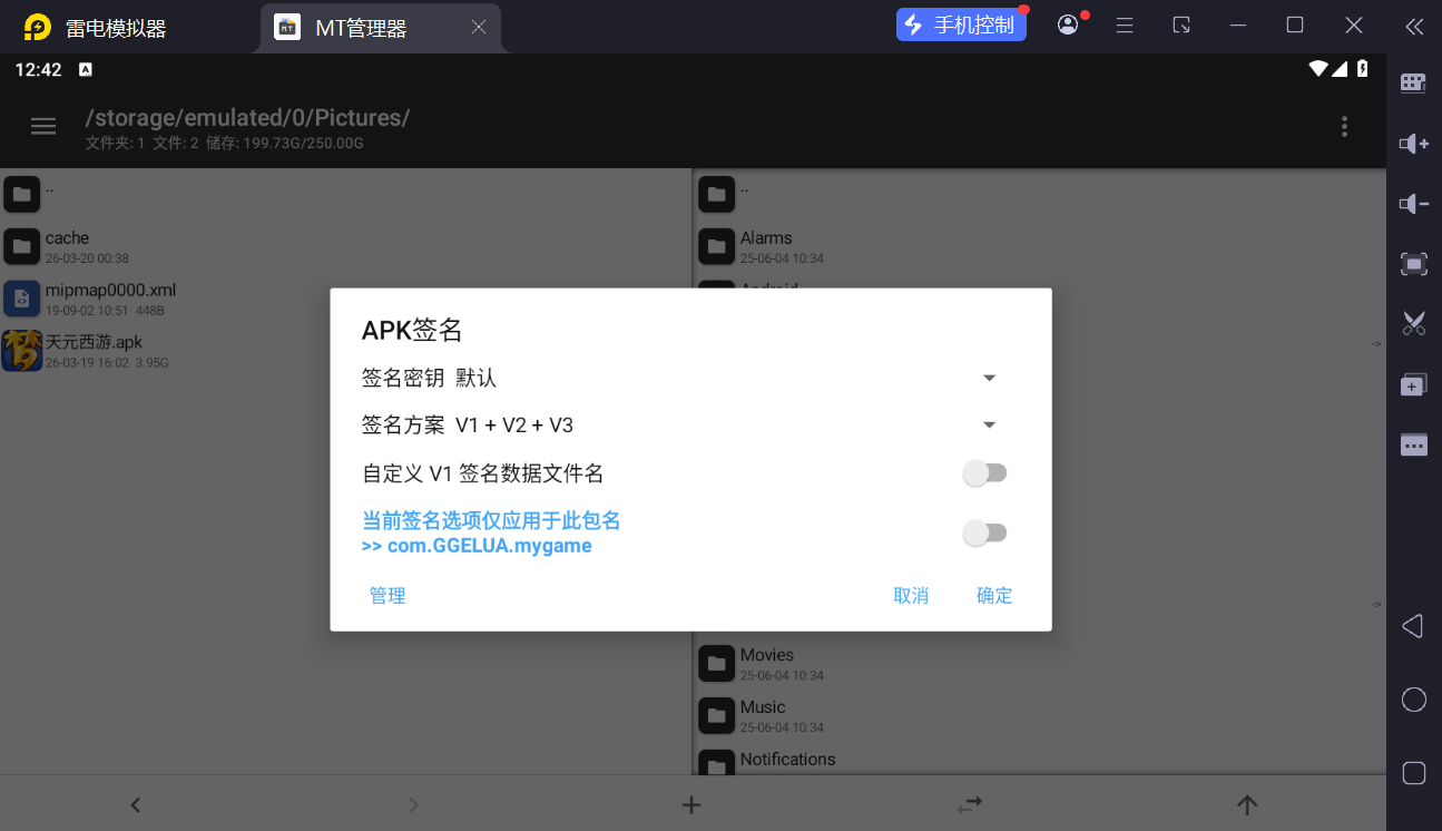 经测试,实际打包好的安卓端,有很小的概率签名失败,所以建议大家使用模拟器 MT 管理器再签名一次,就万无一失了。我安装的是雷电模拟器,将安卓端上传到模拟器共享文件的电脑文件夹,再用 MT 管理器打开找到安卓端,长按安卓端会出现签名按钮,点击进行 V1+V2+V3 签名即可。