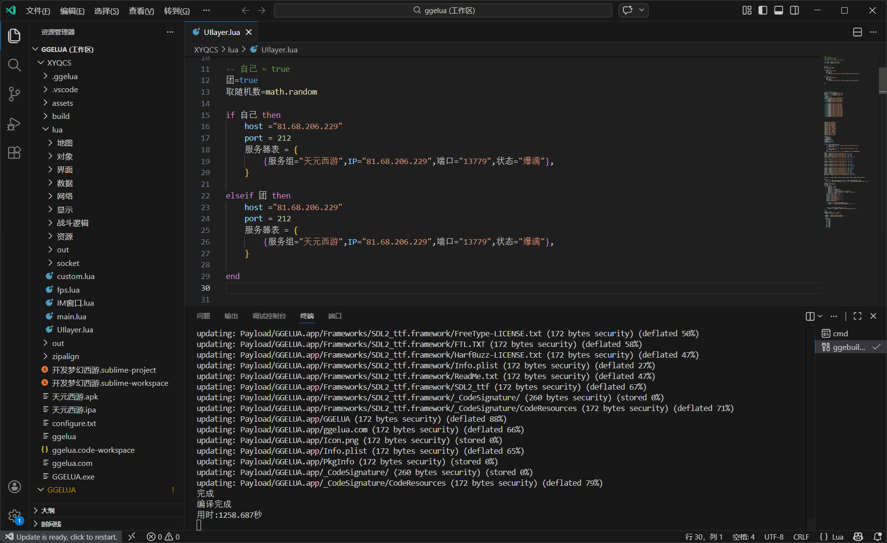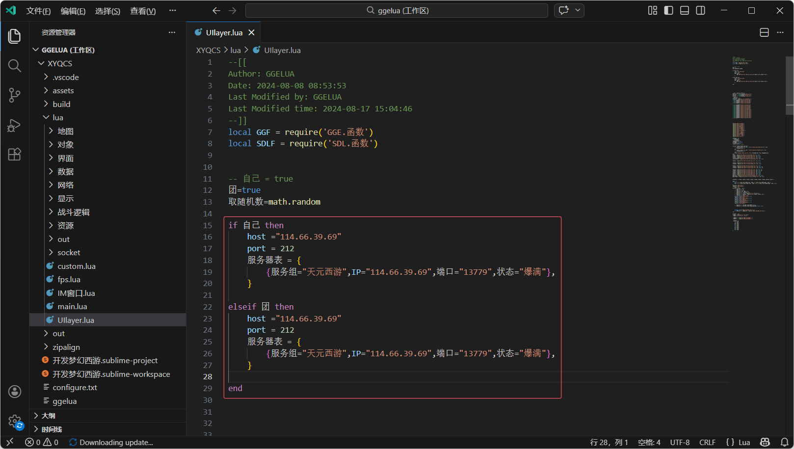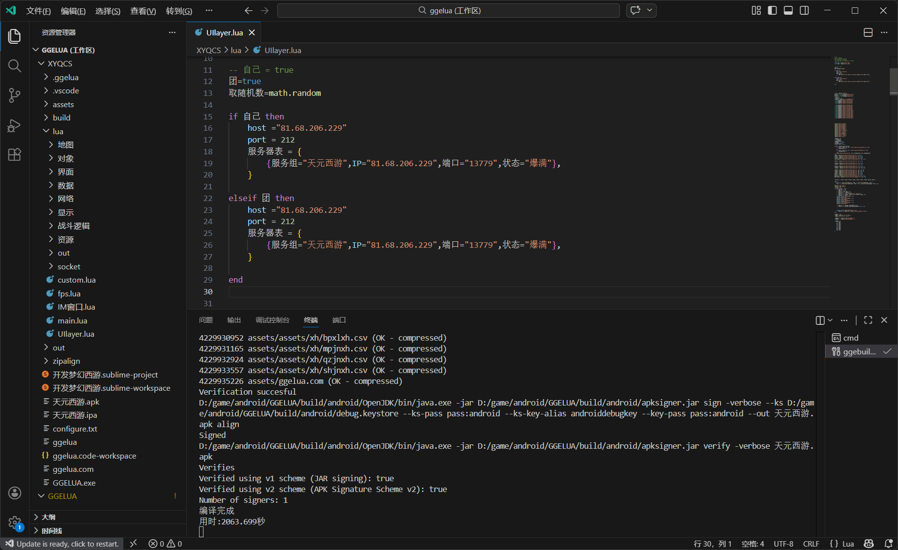 配置好环境变量,我们双击文件\android\XYQCS\ggelua.code-workspace启动 VSCode 编辑器,修改\lua\UIlayer.lua文件,将 IP(114.66.39.69)全部改为你自己的服务器 IP,同样是外网 IP。