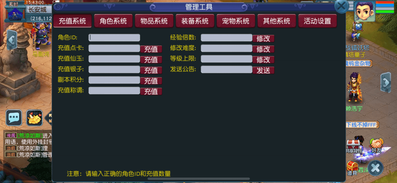 启动进入 PC、安卓和苹果任一客户端,游戏聊天当前界面,注意是当前,系统世界其他的聊天窗口不行。当前聊天窗口输入1发送,开启管理模式,再当前聊天窗口输入工具发送,管理工具就出现了,可以角色充值,活动设置等等。