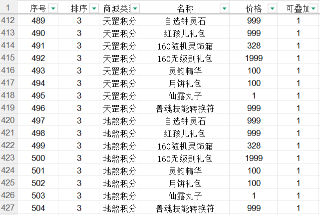 序号按照顺序递增,排序就是物品顺序,填写一样也没关系,商城类型就是要添加到哪个商城,天罡或地煞积分,名称就是添加的物品,价格就是兑换所需要的积分,可叠加 1 代表可以物品叠加,999 个同样的物品也只会占用一个背包格子,0 代表不叠加,一个物品占用一个格子。