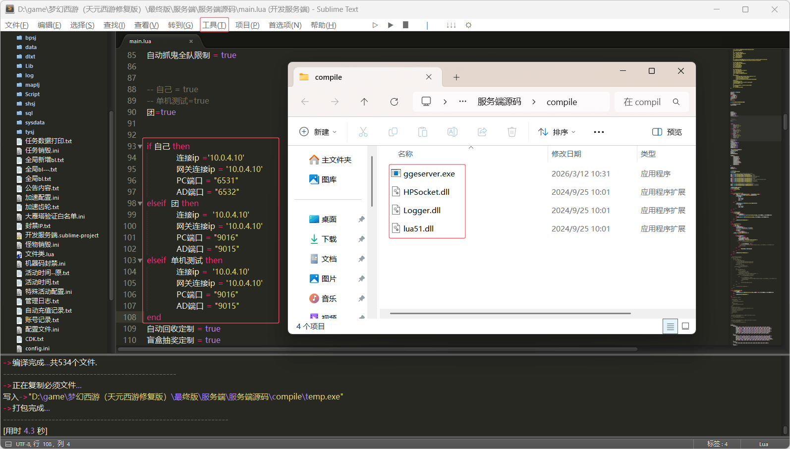 修改完 IP 后保存,点击 sublime 编辑器上方的工具-编译,编译所有的 LUA 文件,编译完后会自动弹窗文件夹,里面会有编译好的 4 个文件。