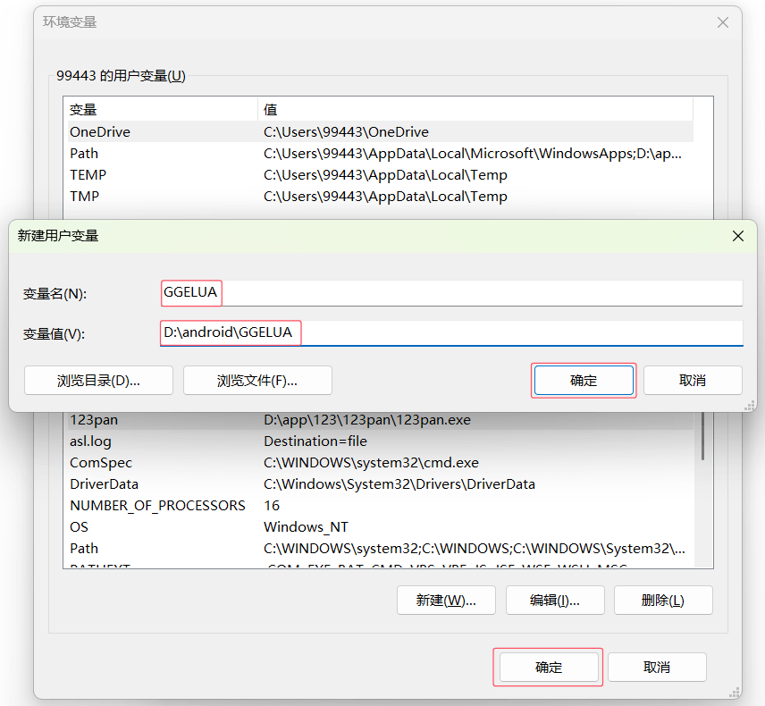 然后填写环境配置,文件名:GGELUA,变量值是GGELUA.exe文件所在的路径,如果你是解压到的 D 盘,那么变量值就是D:\android\GGELUA,确定保存即可。