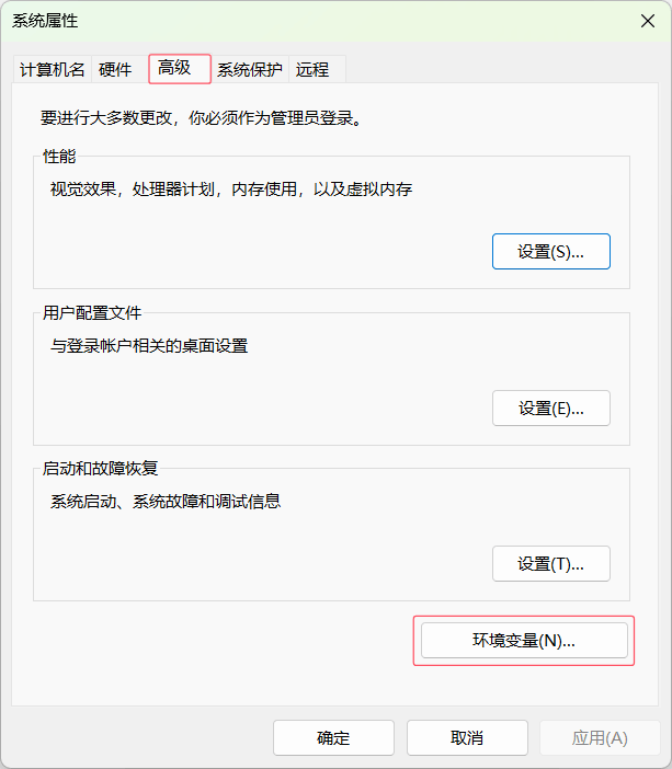 在高级中,找到环境变量,点击进入。