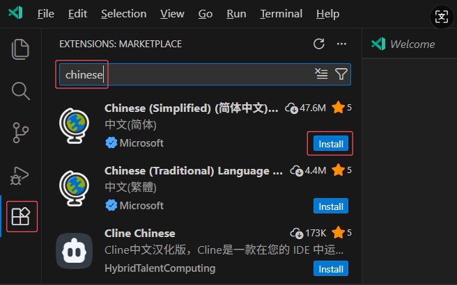首先我们先安装 VSCode 编辑器,找到安装包\工具\VSCodeUserSetup-x64-1.84.0-insider.exe进行安装。安装完后建议安装中文插件,在插件市场中搜索chinese,安装第一个,当然不安装也可以。