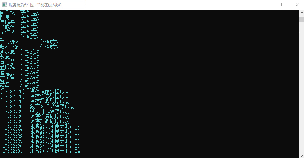 游戏关闭服务,可以直接关闭服务端后台1区命令窗口,会自动触发保存游戏数据,然后再关闭另外两个网关命令窗口。