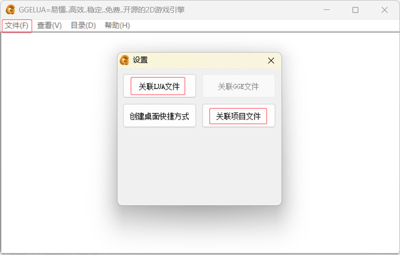 先本机配置 GGE,将资源中的\客户端\gge.zip解压,找到\客户端\gge\ggemain.exe,注意一定要鼠标右键以管理员身份运行,启动后窗口点击左上角文件-设置,然后依次点击关联 LUA 文件和关联项目文件,都会提示成功,这样就完成了本机的 GGE 配置,最后关掉窗口即可。