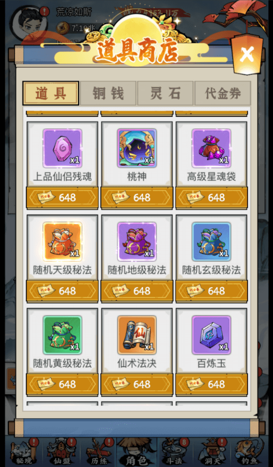 然后对游戏进行了优化,主要是将一些游戏中难获取的道具都放在了市集道具里,并将一些之前无法购买的道具进行了修复。添加的道具包括:随机天级秘法、随机地级秘法、随机玄级秘法、随机黄级秘法、随机下品铭文袋、随机中品铭文袋、随机上品铭文袋、仙术法决、桃神、百炼玉、高级百炼玉、命盘、蓍草、幻灵玉、凤凰金羽、仙兽果、仙盟贡献、仙盟悟性、秘笈点、鱼币、夜明珠、融合丹、淬仙石。