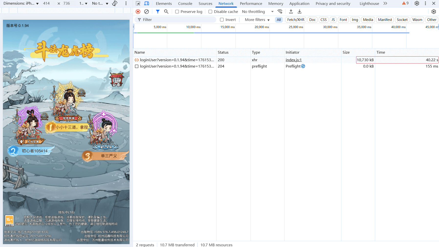 还有一处优化是对游戏经常出现的无法成功登录的问题,需要修改前端的网络请求超时时间,修改文件/www/wwwroot/web-mobile/assets/scriptAsset/index.js,将其中的t.timeoutMs=15e3 15 秒改为t.timeoutMs=60000 60秒,同时登录倒计时排队中的时间字段loginTipTime也改为了 60 秒,对应的客户端文件\assets\apps\H5EFAD055\www\assets\scriptAsset\index.js也需要修改,修改好的文件也在分享的修复目录下,这样大概率是可以进入游戏的,但同样有个致命的问题,就是在请求的过程中会一直请求数据占用宽带资源,这个是由于游戏设计的机制问题造成的,游戏的数据量很大,对于游戏的数据查询做的很粗糙,除非用高配的服务器会好些,所以这个优化改动大家请慎重选择。